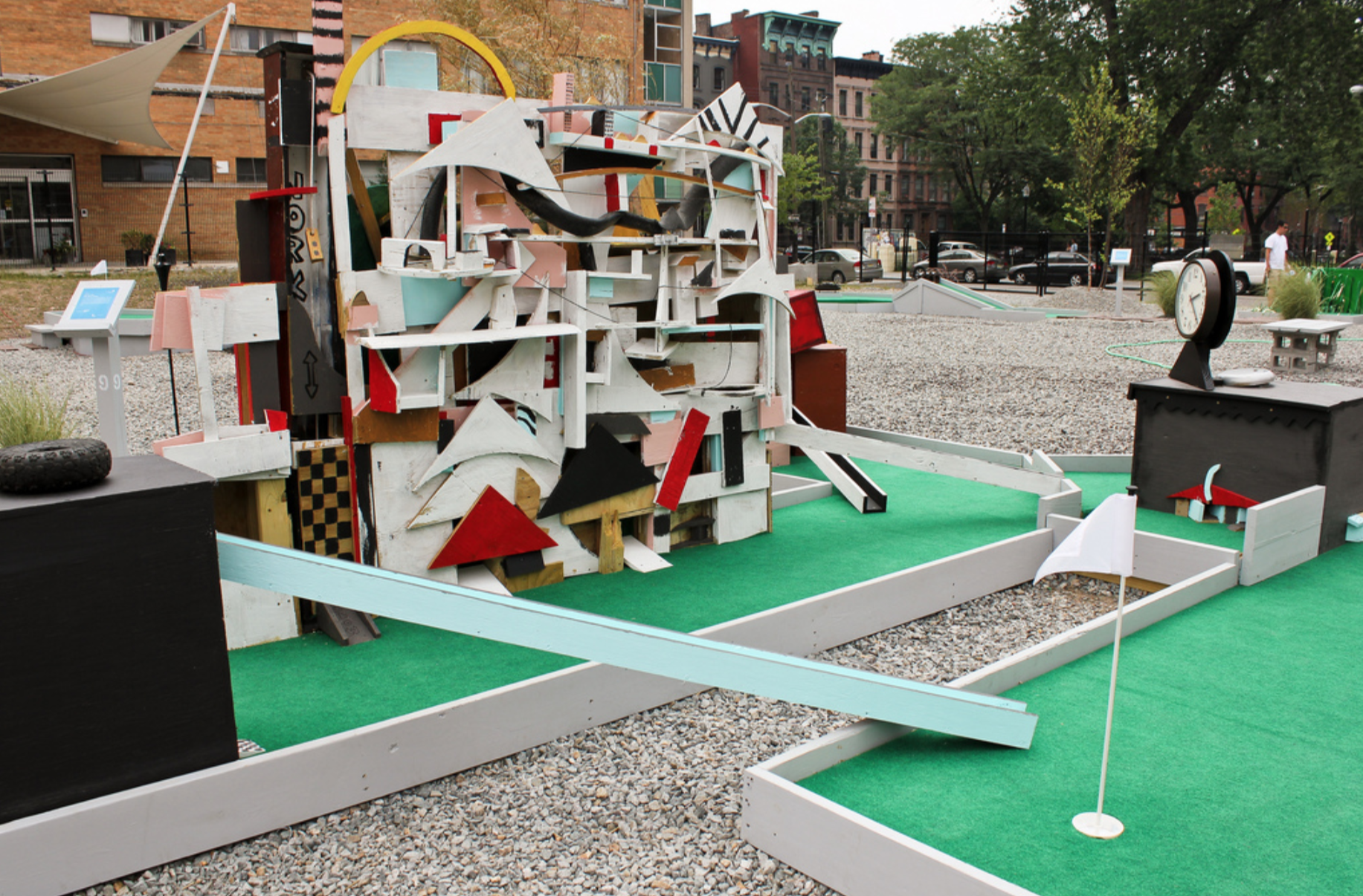 In celebration of Jersey City’s rich history, Jersey City Museum invited artists to create golf holes for an outdoor miniature golf course that represents their interpretations of “The Golden Door.” Ten artists and collaborative artist teams addressed issues related to the golden door concept, such as immigration, economic mobility, transition, obstacles and roadblocks (and the solutions used to circumvent them), and different ways to exemplify “hard work.” Each hole combines recreational functionality with a unique participatory art project that focuses on ingenuity, resourcefulness, and play.